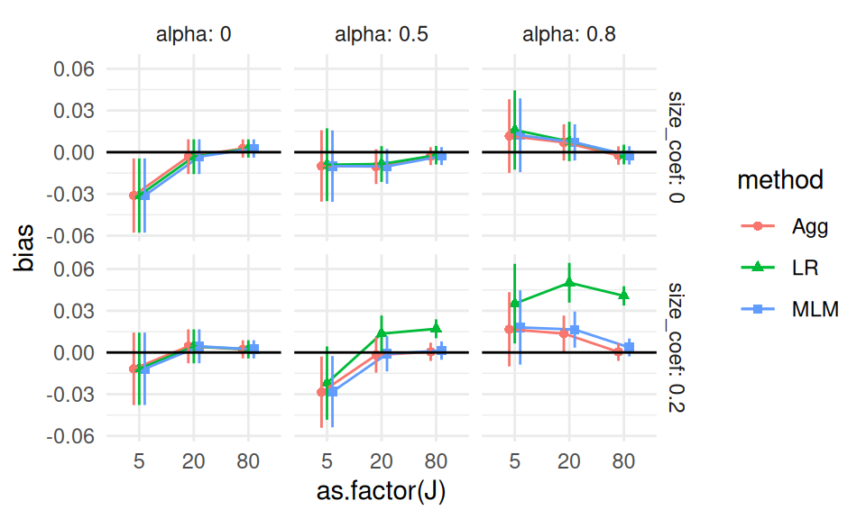 It looks like MLM has more reliably estimated SEs than other methods when ICC is small. Aggregation has more trouble estimating uncertainty when J is small. Finally, LR’s SEs are generally more unstable, relative to its performance, when \(J\) is larger.