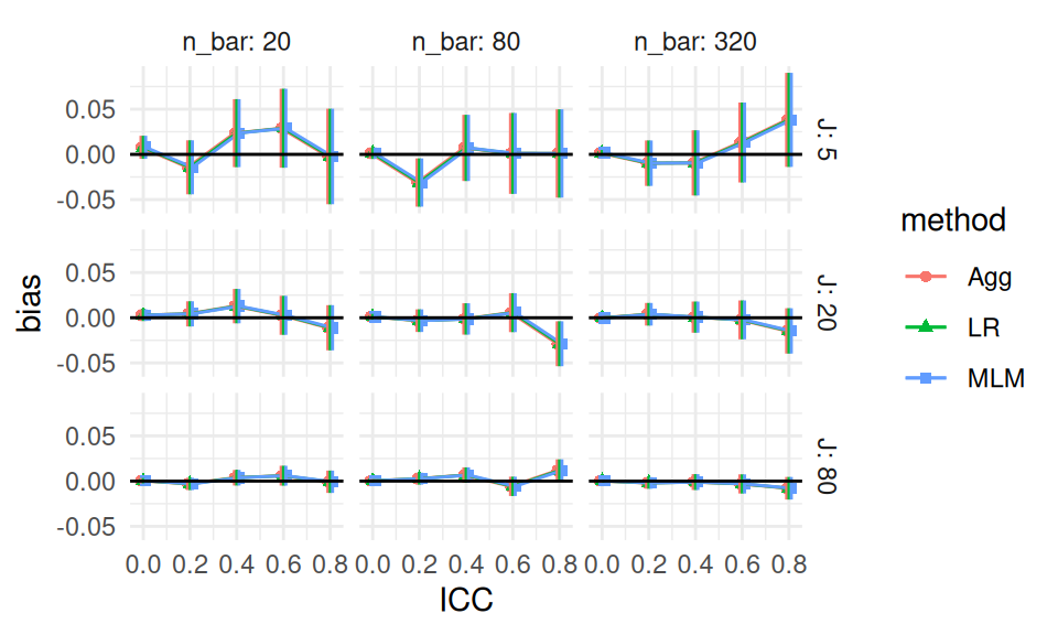 We see that our estimated SEs are about right, on average, across all scenarios. When ICC is 0 and J is small, the MLM SEs are a bit too high. When J is 5, the LR estimator can be a bit low under some circumstances. We can start exploring these trends to dig into why our are wide (suggesting that other factors dictate when the SEs are biased).